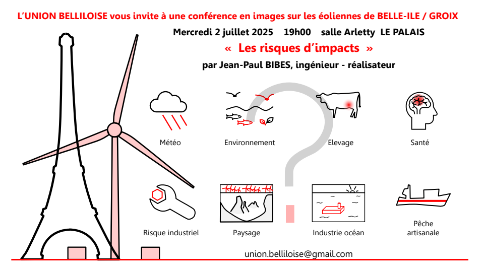 Le projet Pennavel (Bretagne Sud 1) prévoit l’installation de 20 éoliennes flottantes d’une hauteur pouvant atteindre environ 380 mètres en bout de pale selon les dernières données À cette distance, compte tenu de la hauteur des structures et de la topographie de l’île, les machines seraient visibles depuis de nombreux points du littoral bellilois, notamment depuis la côte sauvage, ainsi que depuis le continent.